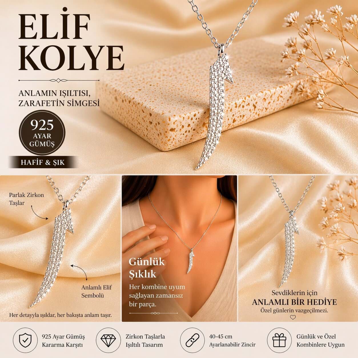 Elif harfinin anlamlı duruşu, zirkon taşların ışıltısıyla birleşerek stiline zarif bir dokunuş katar.