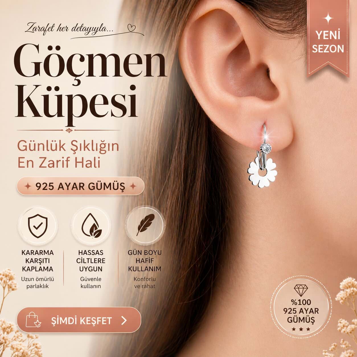 Zarif çiçek detayı ve geleneksel göçmen küpe formuyla öne çıkan bu özel tasarım küpe, klasik şıklığı modern bir dokunuşla buluşturur. Günlük kullanımdan özel davetlere kadar pek çok kombine uyum sağlayan modeliyle stilinizi tamamlar.
