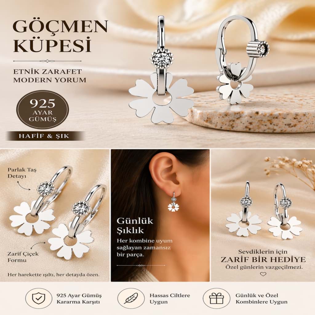 Zarif çiçek detayı ve geleneksel göçmen küpe formuyla öne çıkan bu özel tasarım küpe, klasik şıklığı modern bir dokunuşla buluşturur. Günlük kullanımdan özel davetlere kadar pek çok kombine uyum sağlayan modeliyle stilinizi tamamlar.